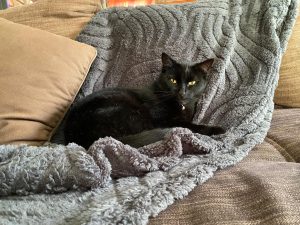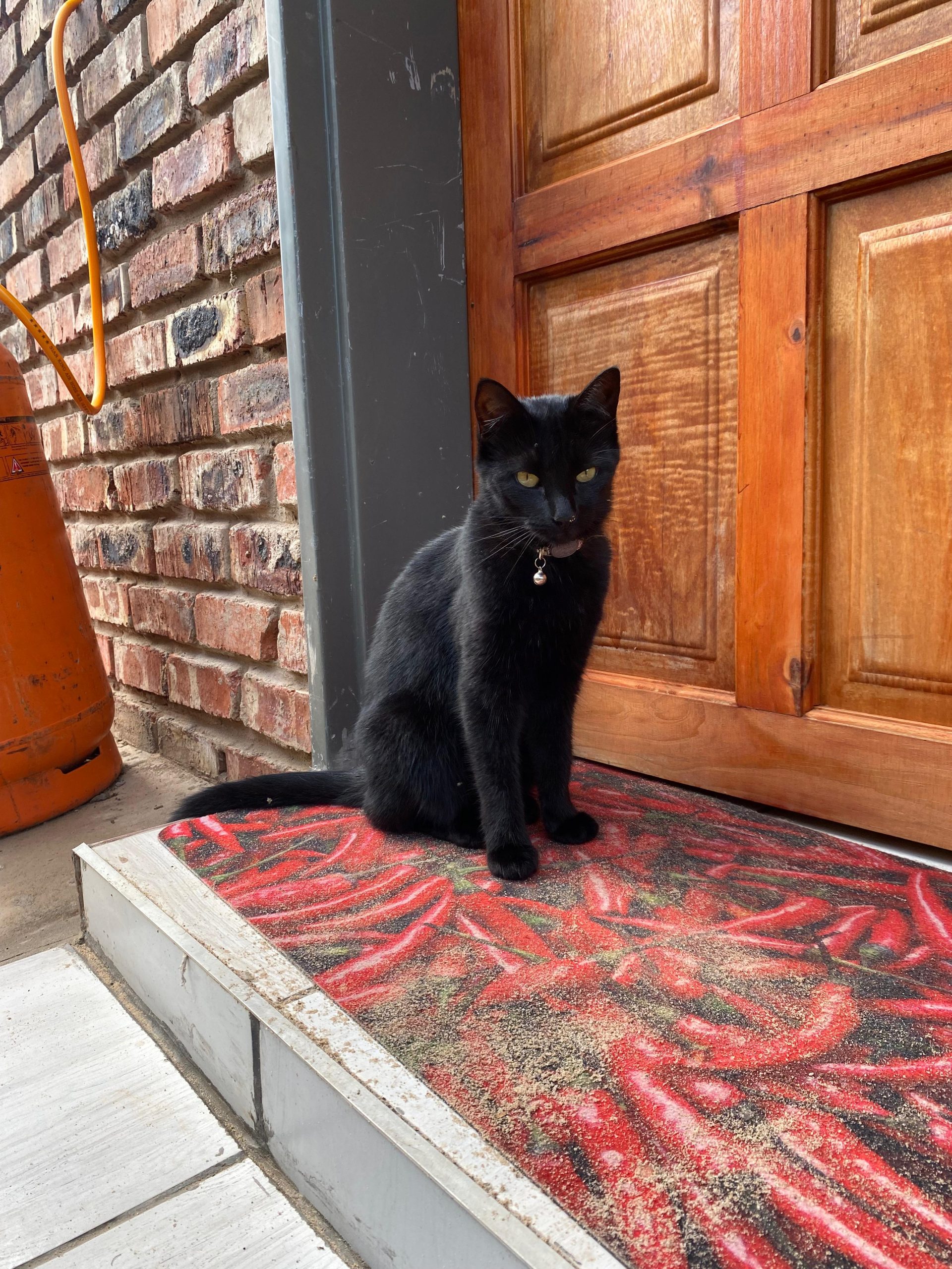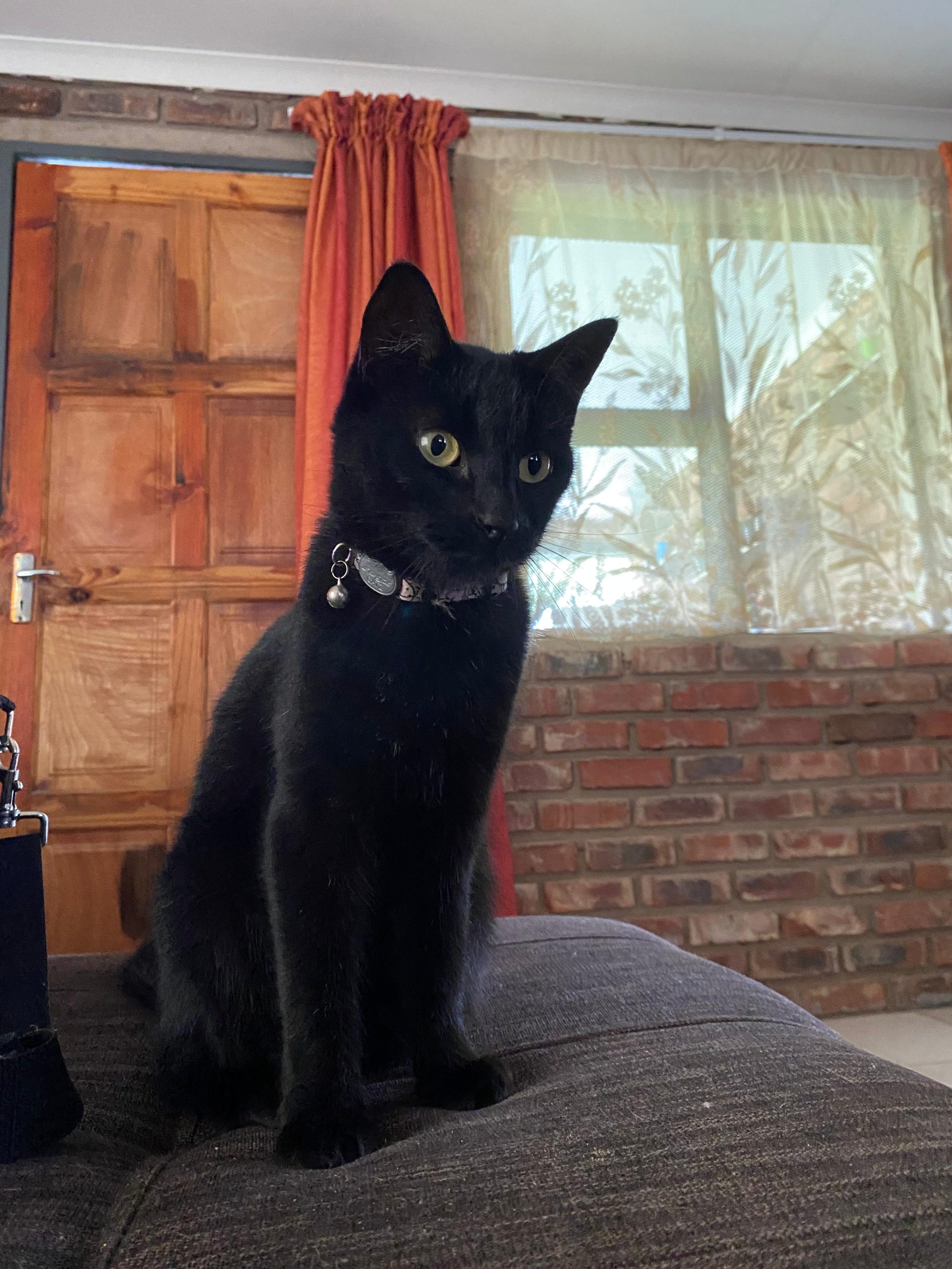 Bombay cat with yellow eyes. Blake fur with a few grey ones. Peach collar with a bell around her neck. Not very big. Responds to “muffin” usually.